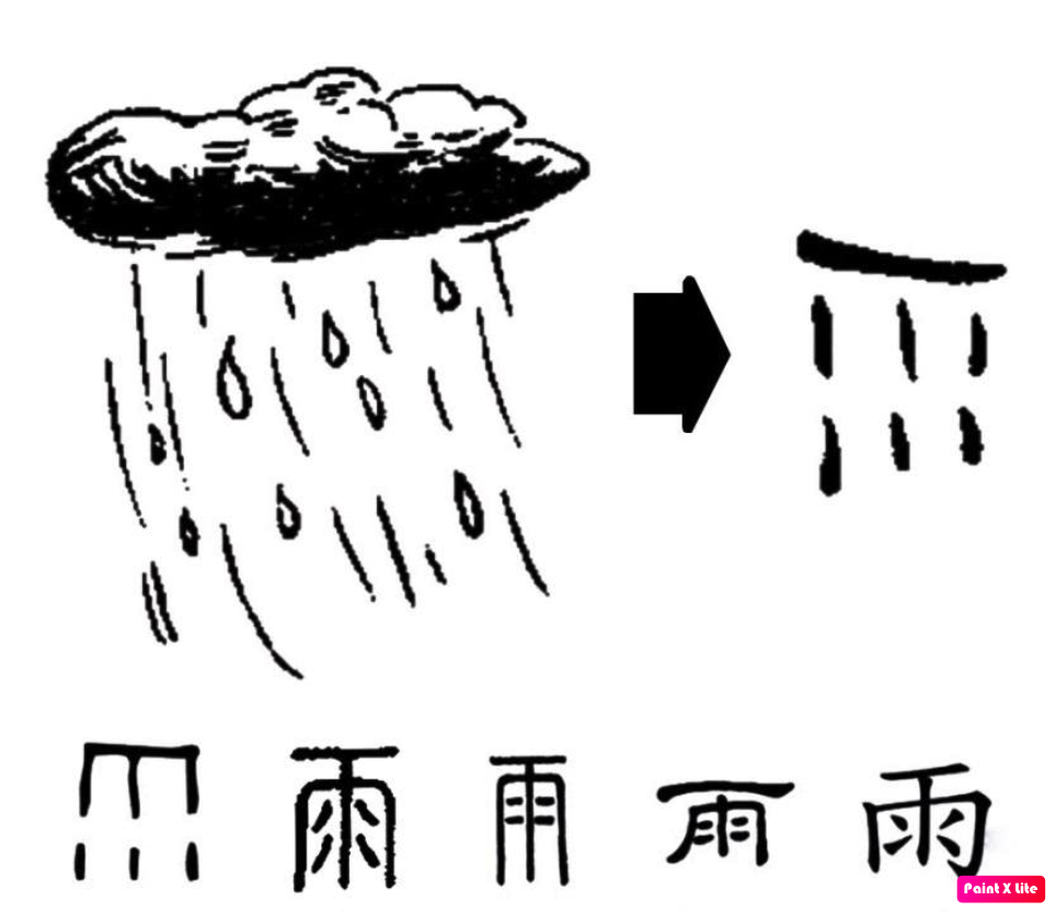 Trong bài này, chúng tôi xin giới thiệu tới quý vị mối quan hệ mật thiết của chữ Vũ (mưa) với cuộc sống hàng ngày. Mưa là nước từ trên trời rơi xuống, cho nên cổ nhân liền tạo chữ này theo phương pháp “tượng hình”. Chữ Vũ trong Giáp cốt văn có hai cách viết, cách viết thứ nhất là  , cách viết thứ hai là; sau đó diễn biến tới Kim văn, viết thành. Phía trên chữ Vũ trong Kim văn  có chữ Nhất đại biểu cho Trời, phần khung phía dưới chữ Nhất là “” biểu thị cho mây, bốn dấu  “” bên trong đại biểu cho giọt nước rơi xuống, qua đó giải thích rõ rằng mưa rơi xuống từ mây ở trên trời, rất truyền thần, sinh động.