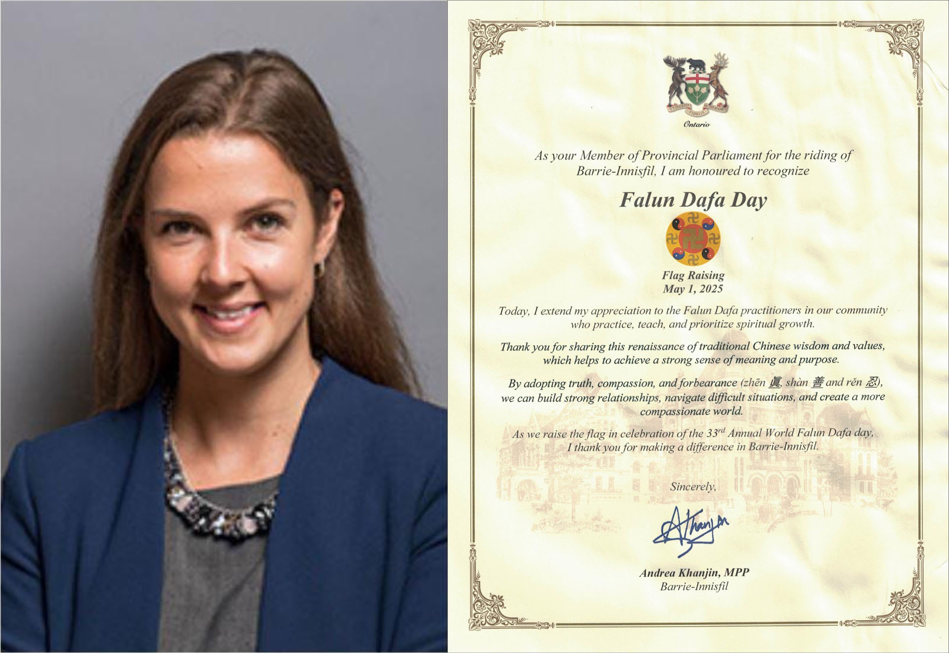 “Với tư cách là Nghị sĩ Quốc hội tỉnh Ontario khu vực bầu cử Barrie – Innisfil, tôi rất vinh dự được tham dự Lễ Thượng cờ Ngày Pháp Luân Đại Pháp vào ngày 01/05/2025;