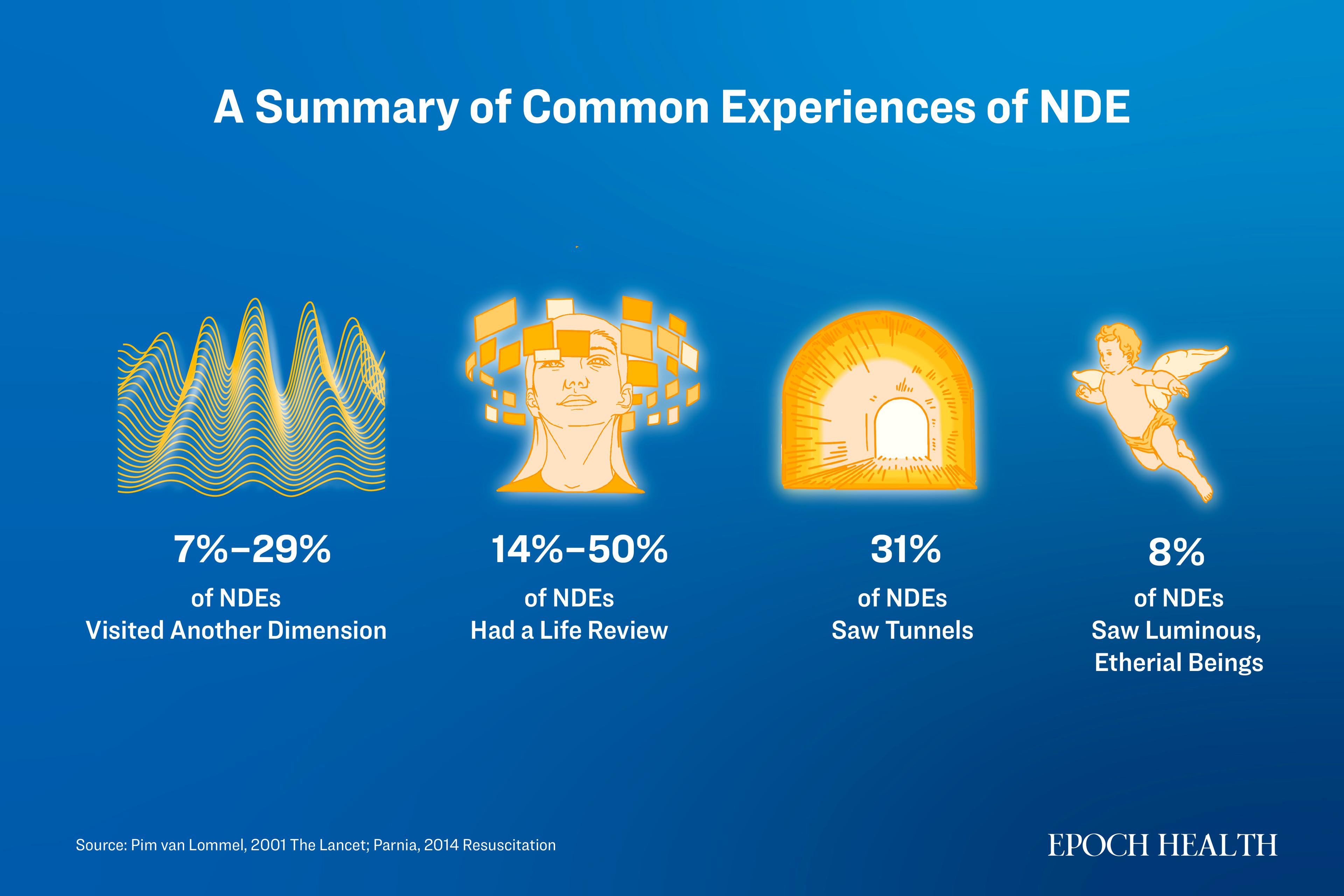 Tóm tắt những trải nghiệm phổ biến trong trải nghiệm cận tử (Near-Death Experience, NDE). 7%–29% số người trải nghiệm cận tử du hành đến một không gian khác, 14%–50% có trải nghiệm nhìn lại cuộc đời, 31% nhìn thấy đường hầm, và 8% gặp các sinh mệnh rực rỡ, đầy ánh sáng phi vật chất. (Ảnh minh họa bởi The Epoch Times)