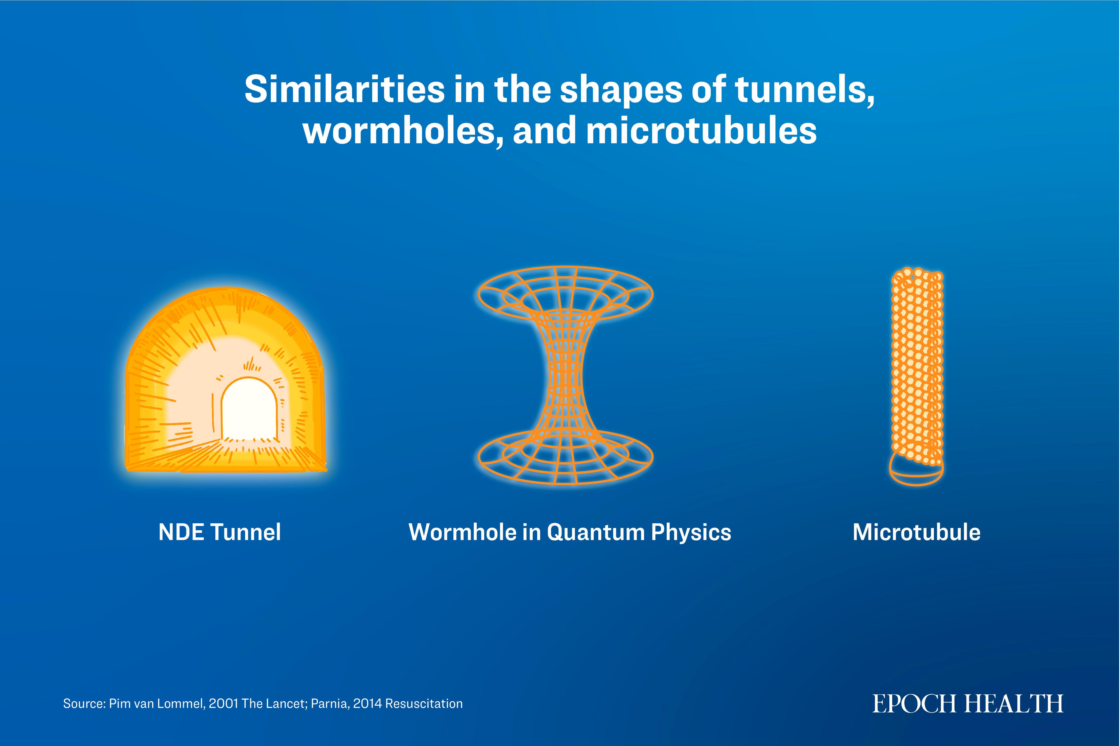 Những điểm tương đồng trong cấu trúc của đường hầm. Từ trái sang phải: đường hầm nhìn thấy trong trải nghiệm cận tử (NDE tunnel), hố sâu không gian trong vật lý lượng tử (Wormhole in Quantum Physics) và vi ống (Microtubule) (Ảnh minh họa bởi The Epoch Times)