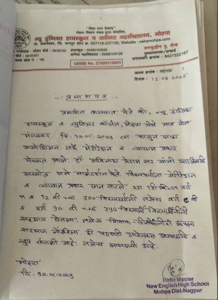 “Trường Trung học và Cao đẳng cơ sở New English, Mohpa chứng nhận rằng Tiến sĩ Avinash Gedam cùng các học viên Pháp Luân Đại Pháp đã hướng dẫn các bài công pháp của Pháp Luân Đại Pháp tại trường vào thứ Ba, ngày 12 tháng 8 năm 2025, với sự tham gia nhiệt tình của khoảng 650 học sinh từ lớp 10–12, cùng đội ngũ giáo viên và nhân viên.