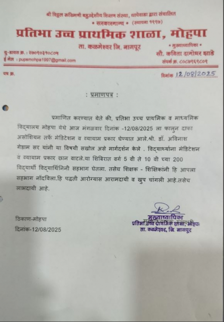 “Trường Tiểu học và Trung học Pratibha, Mohpa, chứng nhận rằng Tiến sĩ Avinash Gedam cùng các học viên Pháp Luân Đại Pháp đã hướng dẫn các bài công pháp của Pháp Luân Đại Pháp tại trường vào thứ Ba, ngày 12 tháng 8 năm 2025 với sự tham gia nhiệt tình của khoảng 200 học sinh từ lớp 5–10, cùng đội ngũ giáo viên và nhân viên.