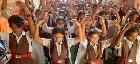 Hình 1. Các học sinh của Trường ‘School of Scholars’ ở Nagpur tập các bài công pháp cùng các học viên.