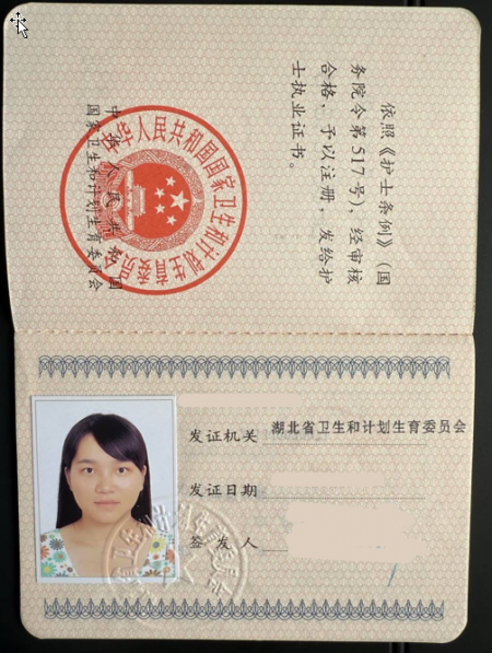 Chứng chỉ hành nghề y tá của Trương Vũ khi cô còn làm việc tại một bệnh viện hạng ba ở Vũ Hán. (Ảnh do người được phỏng vấn cung cấp)
