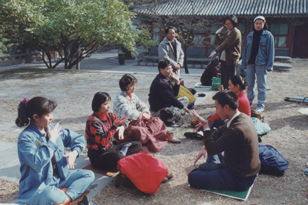 Bà Trần Hinh Lâm (thứ hai từ trái sang) tham gia buổi giao lưu tại Bắc Kinh. Các học viên tại địa phương đã dạy học viên Đài Loan luyện công trực tiếp tại công viên. (NXB Bác Đại cung cấp)