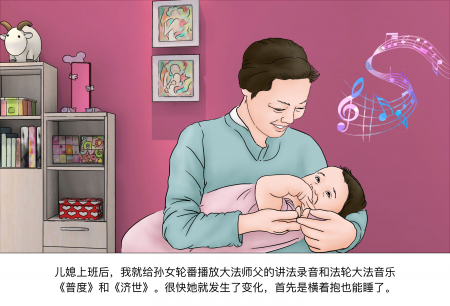 Sau khi con dâu đi làm lại, tôi liền mở cho cháu gái nghe tuần tự các băng giảng Pháp của Sư phụ Đại Pháp cùng nhạc “Phổ độ” và “Tế thế” của Đại Pháp. Rất nhanh sau đó, cháu gái tôi đã thay đổi, đầu tiên là bế ngang cháu cũng ngủ được.