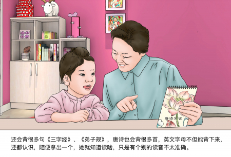 Cháu còn thuộc nhiều câu trong “Tam tự kinh”, “Đệ tử quy” và nhiều bài thơ Đường, cháu còn thuộc lòng bảng chữ cái tiếng Anh. Cháu biết hết các chữ, chỉ cần chọn ra một chữ là cháu biết cách đọc, mặc dù một số chữ phát âm còn chưa đúng lắm.