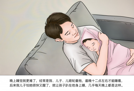 Ban đêm cháu ngủ càng khó hơn, mọi khi thường là tôi, con trai và con dâu thay nhau ẵm cháu đến tận 12 giờ đêm cháu mới ngủ. Sau đó, con trai tôi lo cháu dễ thức giấc nên để cháu nằm sấp trên ngực mình mà ngủ, hầu như đêm nào cũng vậy.