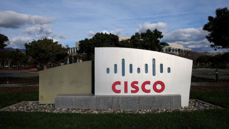 Biểu tượng Cisco trước trụ sở chính của công ty ở San Jose, bang California vào ngày 09/02/2024. (Ảnh: Justin Sullivan/Getty Images)