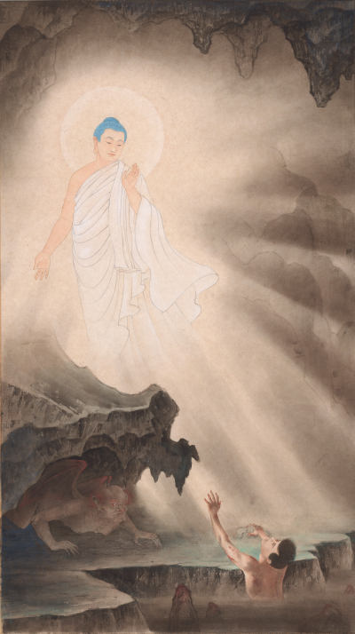 Bức tranh này là sáng tác mang tính ẩn dụ hiện thực, phần dưới bức tranh là hình ảnh một người đang khổ sở cố gắng trèo lên bờ vực của một hồ nước đầy đau khổ (ẩn dụ cho hoàn cảnh tà ác dưới sự cai trị của ĐCSTQ), dưới sự giám sát của con quỷ đỏ ngoại lai, anh dùng chút ý niệm cuối cùng để cầu xin Sáng Thế Chủ, Phật Chủ từ bi đột nhiên xuất hiện, ánh sáng thánh thiện của Ngài soi sáng người đàn ông mình đầy thương tích đang hấp hối. Toàn bộ bức tranh, con người và ác quỷ cùng tồn tại trong một không gian, điều này triển hiện rằng môi trường sống của con người thực sự đầy rẫy nguy hiểm, chỉ có đức tin chân chính vào Thần Phật mới là hy vọng duy nhất của nhân loại trong thời mạt thế này. Hy vọng tất cả chúng sinh sớm minh bạch chân tướng, thoát khỏi xiềng xích của quỷ đỏ và trở về gia viên chân chính.