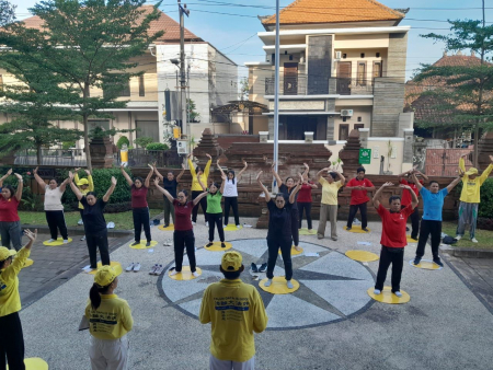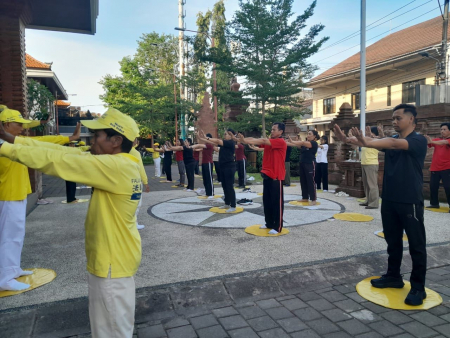 Đây là một phần của chương trình Jumat Krida, hoạt động thể dục buổi sáng vào thứ Sáu hàng tuần dành cho nhân viên chính phủ. Trong buổi hướng dẫn của các học viên, hàng chục nhân viên Văn phòng khu vực Bắc Kuta đã học các bài công pháp của Pháp Luân Đại Pháp. Hoạt động diễn ra từ 7 giờ đến 10 giờ sáng.