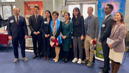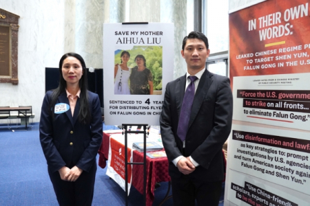Ngày 10/12/2025, Vương San San (Lydia Wang) và Vương Toàn (Steven Wang) (bên phải) tham dự hoạt động Ngày Nhân quyền Thế giới tại tòa nhà Rayburn của Hạ viện Hoa Kỳ, kêu gọi chính phủ Mỹ cứu mẹ của họ là bà Lưu Ái Hoa, một học viên Pháp Luân Công. (Lý Thần/The Epoch Times)
