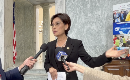 Nghị sĩ Young Kim trả lời phỏng vấn truyền thông tại hiện trường. (NTD tiếng Anh)