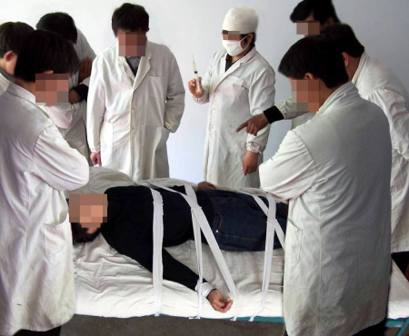 Tái hiện cảnh tra tấn: Tiêm thuốc độc (thuốc không rõ nguồn gốc). (Minghui.org)