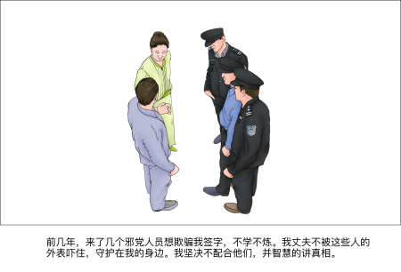 Mấy năm trước, một số đảng viên ĐCSTQ đã đến và cố gắng lừa tôi ký giấy không học không luyện. Chồng tôi không hề sợ hãi trước vẻ ngoài của họ, vẫn ở bên cạnh bảo vệ tôi. Tôi kiên quyết từ chối hợp tác, lại còn dùng trí huệ giảng chân tướng cho họ.