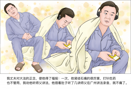 Chính niệm của chồng tôi đối với Đại Pháp đã mang lại phúc báo cho anh. Có lần, anh ấy bị sỏi thận rất đau, tiêm thuốc đều không có tác dụng. Tôi khuyên anh ấy nghe các bài giảng của Sư phụ, anh ấy vừa ôm bụng vừa nghe một số bài giảng của Sư phụ ở Quảng Châu, liền không đau nữa.