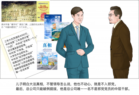 Con trai tôi đã minh bạch chân tướng về Đại Pháp, lãnh đạo nói gì cháu cũng không động tâm; chỉ đơn giản là từ chối gia nhập ĐCSTQ. Cuối cùng, tổng công ty không còn lựa chọn nào khác ngoài việc phá lệ và thăng chức cho cháu; cháu là quản lý cấp trung duy nhất trong tổng công ty không phải là đảng viên.