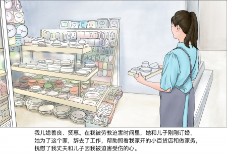 Con dâu tôi thì hiền lành, đức hạnh. Cháu và con trai tôi vừa đính hôn vào thời điểm tôi bị bức hại trong trại lao động. Vì gia đình, cháu đã nghỉ việc để giúp chúng tôi quản lý cửa hàng tạp hóa nhỏ và làm việc nhà, nhờ đó xoa dịu nỗi đau mà chồng con tôi phải chịu đựng khi tôi bị bức hại.