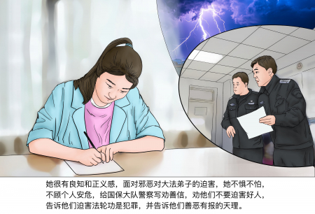 Con dâu tôi rất có lương tâm, trọng nghĩa khí, không hề sợ hãi trước cuộc bức hại các đệ tử Đại Pháp của tà ác. Coi nhẹ an toàn cá nhân, cháu viết thư thuyết phục cảnh sát Đội An ninh Quốc gia, khuyên họ không nên bức hại người tốt, nói với họ rằng bức hại Pháp Luân Công là phạm tội, lại nói cho họ biết về thiên lý thiện ác hữu báo.