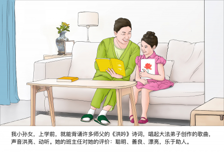 Cháu gái tôi trước khi đi học đã có thể đọc thuộc lòng nhiều bài thơ của Sư phụ trong tập Hồng Ngâm và hát những bài hát do các đệ tử Đại Pháp sáng tác, giọng cháu to và hay. Cô giáo chủ nhiệm của cháu đánh giá cháu là người thông minh, tốt bụng, xinh đẹp, vui vẻ giúp đỡ người khác.
