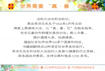 Khi lần đầu tiên đọc xong cuốn “Chuyển Pháp Luân”, ba chữ “Chân – Thiện – Nhẫn” đã ăn sâu vào sinh mệnh tôi, tôi quyết định học Pháp Luân Công, phản bổn quy chân.