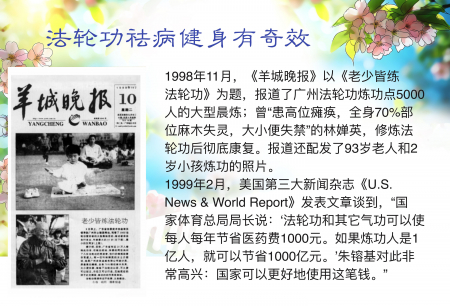 Tháng 11/1998, tờ Yangcheng Evening News đăng bài viết có tựa đề “Mọi lứa tuổi đều tập Pháp Luân Công”, đưa tin về một buổi luyện công buổi sáng quy mô lớn tại một điểm luyện tập Pháp Luân Công ở Quảng Châu với 5.000 người tham gia. Bài viết cũng đề cập đến việc bà Lâm Thiền Anh (Lin Chanying), bà bị liệt cấp độ nặng, tê liệt và mất chức năng ở 70% cơ thể, cùng chứng tiểu không tự chủ, đã hoàn toàn hồi phục sau khi tập Pháp Luân Công. Bài viết cũng đăng kèm hình ảnh một cụ bà 93 tuổi và một em bé 2 tuổi đang tập các bài công pháp.
