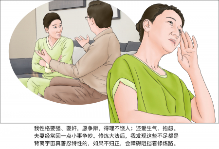 Tính cách tôi hiếu thắng, thích dùng mánh khóe, hay tranh luận, chiếm lý thì không tha cho người khác; tôi cũng dễ nổi giận và phàn nàn. Vợ chồng tôi thường cãi nhau vì những chuyện nhỏ nhặt. Sau khi tu luyện Pháp Luân Đại Pháp, tôi nhận ra những thiếu sót này đều trái với đặc tính Chân – Thiện – Nhẫn của vũ trụ. Nếu tôi không quy chính, chúng sẽ trở thành chướng ngại cản trở con đường tu luyện của tôi.