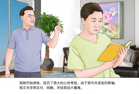 Khi mới bắt đầu tu luyện, tôi đã trải qua những khảo nghiệm tâm tính rất lớn. Bị những lời dối trá của Đảng Cộng sản Trung Quốc lừa gạt, chồng tôi kịch liệt phản đối, xúc phạm, tạo ra ma nạn rất lớn với tôi.