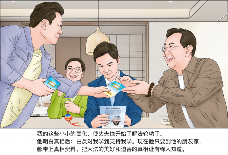 Những thay đổi nhỏ này trong tôi đã khiến chồng tôi cũng bắt đầu hiểu về Pháp Luân Công. Sau khi minh bạch chân tướng, anh ấy đã chuyển từ phản đối sang ủng hộ tôi học. Giờ đây, mỗi khi đến thăm bạn bè, anh ấy đều mang theo tài liệu chân tướng để cho những người hữu duyên hiểu về vẻ đẹp của Đại Pháp và sự thật về cuộc bức hại.