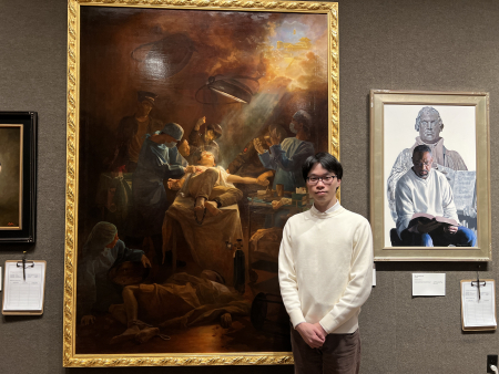 Ngày 20/01/2026, họa sĩ người Đài Loan Thái Thiếu Hàng tham gia triển lãm các tác phẩm vào vòng chung kết với bức tranh “Mổ cướp nội tạng sống” và đạt giải Đồng. (Ảnh: Thi Bình/The Epoch Times)