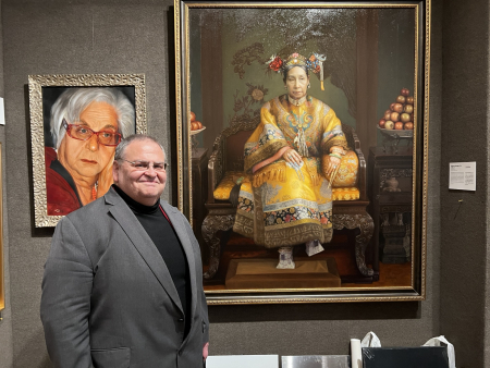 Ngày 20/01/2026, triển lãm các tác phẩm lọt vào vòng chung kết và Lễ trao giải Cuộc thi quốc tế tranh sơn dầu tả thực nhân vật của NTD lần thứ 7 năm 2025 đã chính thức khai mạc tại Salmagundi Club, Manhattan. Trong ảnh là họa sĩ Ken Corbertt và tác phẩm “The Widow’s Mite” của anh. (Ảnh: Đới Binh/The Epoch Times)