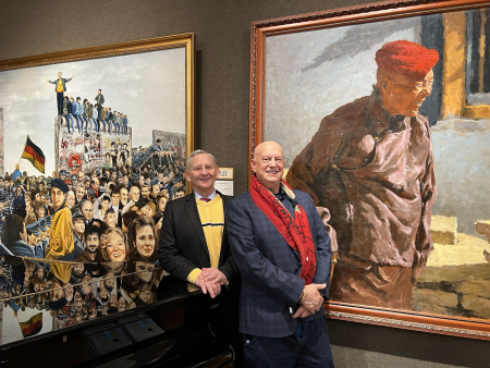Ngày 22/1/2026, nghệ sĩ New York ông John deSoto (bên phải) cùng bạn của ông, nghệ sĩ Lou Janda đến tham quan triển lãm các tác phẩm của Cuộc thi vẽ tranh sơn dầu của NTD lần thứ 7. (Ảnh: Thi Bình/The Epoch Times)