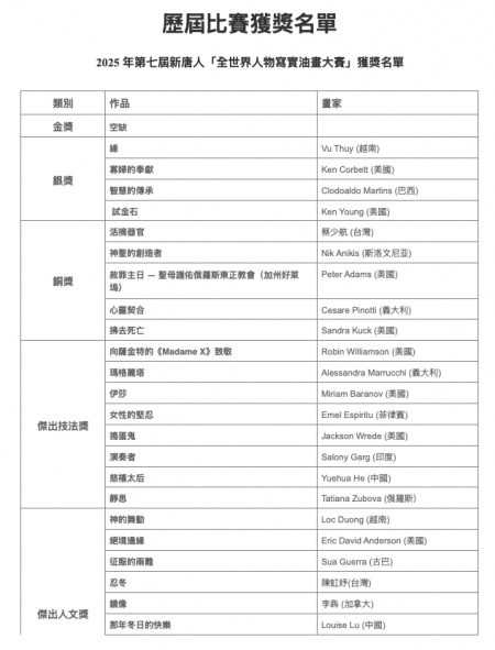 Tối 22/1/2026, Cuộc thi quốc tế vẽ tranh sơn dầu tả thực nhân vật của NTD đã công bố danh sách đoạt giải. Tổng cộng có 53 họa sĩ đoạt giải; không có giải Vàng, 4 giải Bạc, 5 giải Đồng. (Ảnh: Tân Đường Nhân)