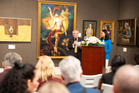 Lễ trao giải Cuộc thi quốc tế vẽ tranh sơn dầu tả thực nhân vật của NTD lần thứ 7, chủ tịch hội đồng giám khảo, Giáo sư Trương Côn Luân gửi lời chúc mừng đến tất cả các thí sinh đoạt giải. (Ảnh: Đới Binh/The Epoch Times)