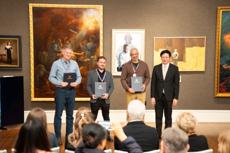 Tại lễ trao giải Cuộc thi quốc tế vẽ tranh sơn dầu tả thực nhân vật của NTD lần thứ 7, Tổng Giám đốc NTD, Tiến sĩ Chu Thế Vũ, trao giải Bạc. (Ảnh: Đới Binh/The Epoch Times)