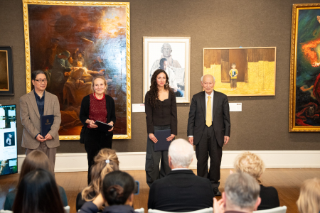 Lễ trao giải Cuộc thi quốc tế vẽ tranh sơn dầu tả thực nhân vật của NTD lần thứ 7, chủ tịch hội đồng giám khảo, Giáo sư Trương Côn Luân (phải) trao giải “Kỹ pháp xuất sắc” cho người đoạt giải. (Ảnh: Đới Binh/The Epoch Times)