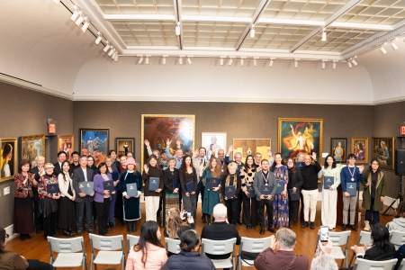 Lễ trao giải Cuộc thi quốc tế vẽ tranh sơn dầu tả thực nhân vật của NTD lần thứ 7, các nghệ sĩ đoạt giải có mặt tại buổi lễ cùng chụp ảnh lưu niệm. (Ảnh: Đới Binh/The Epoch Times)
