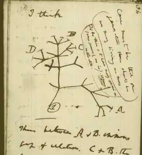 Darwin cho rằng tất cả các sinh vật sống đều tiến hóa từ một tổ tiên chung, các sinh vật sống có thể tiến hóa từ loài này sang loài khác. Ông đã vẽ một cây tiến hóa (evolutionary tree) hay còn gọi là “cây sự sống” dựa trên mối quan hệ giữa hình dạng, cấu trúc và đặc điểm của các sinh vật khác nhau. Các loài được sắp xếp theo thời gian xuất hiện và phát triển dần dần từ phần thân cây đến cành và lá của cây.