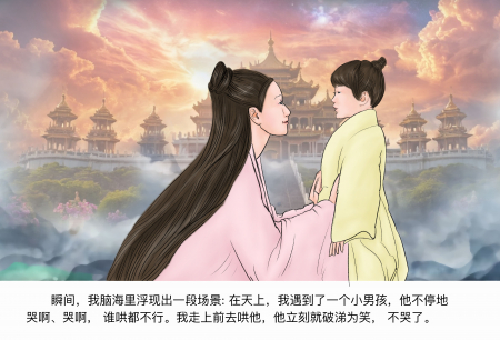 Trong khoảnh khắc, trong đầu tôi hiện lên một cảnh tượng: Khi ở thiên giới, tôi đã gặp một cậu bé, cậu bé cứ khóc mãi, ai dỗ cũng không nín. Tôi đi tới dỗ cậu bé, thì lập tức cậu bé nín khóc, miệng mỉm cười trở lại.