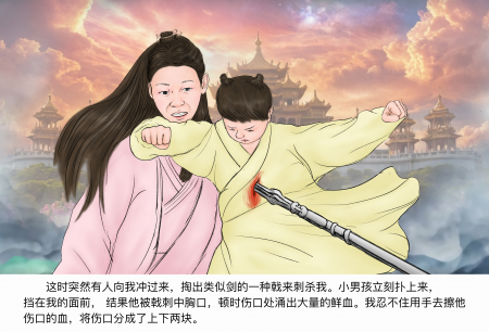 Bỗng nhiên ngay lúc ấy, có ai đó xông thẳng về phía tôi, rút ra một thứ giống như thanh kiếm muốn đoạt mệnh tôi. Cậu bé lập tức lao tới chắn phía trước, kết quả bị cây giáo đâm trúng ngực, máu từ vết thương tuôn ra rất nhiều. Tôi không chịu được đưa tay lau máu đang tuôn ra, chia vết thương thành hai phần một trên một dưới.