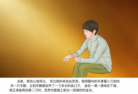 Đêm hôm đó, tôi một mình khóc trong đau đớn, khóc cho số phận của mình sao lại khổ thế này. Tôi dùng bàn tay run rẩy cầm con dao nhỏ, rạch vào cổ tay còn lại, lập tức tay tôi bị rạch một vết thương dài hơn một tấc, máu từng giọt chảy xuống. Khi tôi chuẩn bị rạch nhát thứ hai thì bỗng nhiên bức tường đối diện phát ra ánh kim quang rực rỡ.
