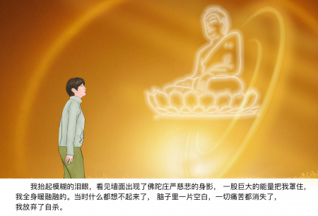 Tôi ngẩng đầu, ngước đôi mắt ngấn lệ lên nhìn bức tường trong mơ hồ, nhìn thấy trên tường hiện ra thân ảnh một vị Phật trang nghiêm và từ bi, một luồng năng lượng cực đại bao trùm lấy tôi, toàn thân tôi cảm thấy vô cùng ấm áp dễ chịu. Khi đó, tôi không còn nghĩ gì nữa, trong đầu tôi trống rỗng, toàn bộ đau khổ đều tan biến, tôi đã từ bỏ ý định tự sát.