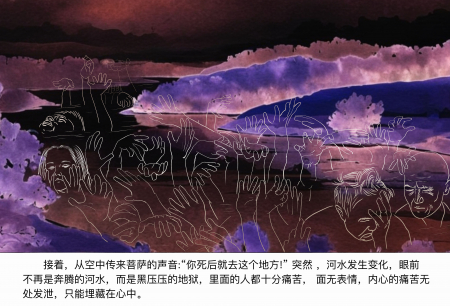 Tiếp đó, trong không trung truyền đến tiếng nói của Bồ Tát: “Sau khi chết, con phải đến nơi này!” Lập tức, dòng sông liền phát sinh biến hóa, trước mắt tôi không còn dòng sông cuồn cuộn nữa, mà là một địa ngục tối tăm, người bên trong đó đều vô cùng thống khổ, gương mặt vô hồn, thống khổ trong tâm không có nơi nào phát tiết, chỉ có thể chôn vào trong tim.
