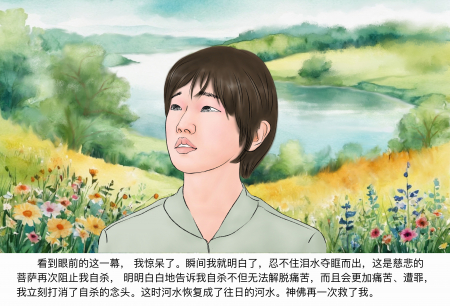 Nhìn thấy cảnh tượng trước mắt, tôi vô cùng sợ hãi. Trong chớp mắt tôi chợt hiểu ra, nước mắt tuôn dài trên má, chính là Bồ Tát từ bi lại một lần nữa ngăn cản tôi tự sát, nói rõ cho tôi biết tự sát chẳng những không thể giải thoát khỏi thống khổ, mà sẽ càng thống khổ hơn, tạo tội. Tôi lập tức vứt bỏ niệm đầu tự sát của mình. Ngay lúc đó, dòng sông lại khôi phục như bình thường. Thần Phật lại một lần nữa cứu sống tôi.