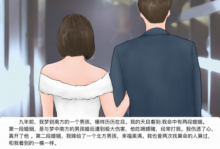 Chín năm trước, tôi mơ thấy có một chàng trai đến từ phương Nam, dáng vẻ hiện lên rõ ràng trước mắt. Thiên mục tôi nhìn thấy: Trong mệnh của tôi có hai cuộc hôn nhân. Cuộc hôn nhân thứ nhất là sau khi kết hôn với người đến từ phương Nam ấy, sẽ phải chịu tổn thương vô cùng lớn, anh ấy rượu chè, ăn chơi trác tán và thường xuyên đánh tôi. Tôi đau đớn tột cùng và đã rời bỏ anh ta. Cuộc hôn nhân thứ hai, tôi lấy một chàng trai đến từ phương Bắc và hạnh phúc mỹ mãn. Tôi cũng từng hai lần đi xem bói, hoàn toàn giống với những gì tôi đã nhìn thấy.