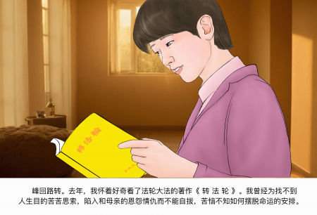 Đường đời quanh co khúc khuỷu, năm ngoái, tôi cảm thấy tò mò nên đã đọc quyển sách Chuyển Pháp Luân của Pháp Luân Đại Pháp. Trước đó tôi từng đau khổ suy tư vì không tìm được mục đích nhân sinh, lún sâu vào ân oán tình thù với mẹ mà không tự thoát ra được, khổ não không biết làm sao để thoát khỏi an bài của số mệnh.