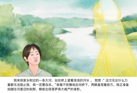 Tôi đi đến một con sông lớn gần nhà, đứng trên cầu nhìn dòng nước đang cuồn cuộn chảy. Tôi nghĩ: “Lần này, không có sức mạnh nào có thể ngăn cản tôi, tôi nhất định sẽ tự sát”. Tôi không chút do dự đi xuống dưới cầu, hai mắt nhìn thẳng. Ngay khoảnh khắc tôi chuẩn bị nhấc chân bước xuống sông, trước mắt tôi xuất hiện thân ảnh một vị Bồ Tát cao lớn uy nghiêm.
