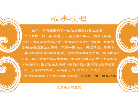 Năm ngoái, cạnh nhà tôi có một cô gái chuyển đến sinh sống. Cô tên là Tiểu Anh (hóa danh), hơn 20 tuổi, gương mặt tròn trịa, tính cách hào sảng. Tuy dung mạo không nổi bật nhưng là người có căn cơ tiên thiên, có công năng túc mệnh thông, có thể nhìn thấy những sự việc xảy ra trong tương lai, cũng có thể nhìn thấy các sự việc đã xảy ra trong quá khứ. Tôi mới gặp cô lần đầu mà như đã quen biết từ lâu, chuyện gì cũng có thể tâm sự như hai người bạn thân. Trong một lần trò chuyện, Tiểu Anh kể rằng cô đã từng muốn tự tử hai lần nhưng đều không thành, mỗi lần đều được Thần Phật can thiệp cứu sống. Cô cũng tâm sự với tôi nhiều điều cô thắc mắc trong lòng nhưng chưa được giải đáp.