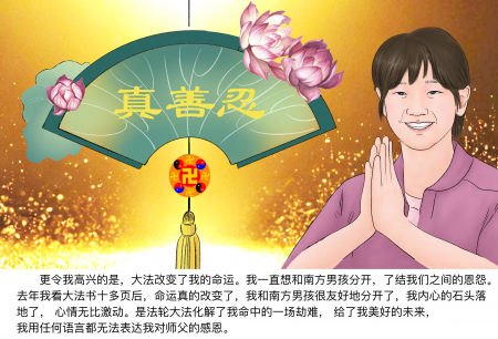 Điều càng khiến tôi vui mừng hơn là, Đại Pháp đã thay đổi cuộc đời tôi. Tôi luôn muốn chia tay với người bạn trai đến từ phương Nam, kết thúc ân oán giữa chúng tôi. Năm ngoái, khi tôi mới đọc được hơn mười trang sách Đại Pháp, số phận của tôi thật sự đã biến đổi, tôi và chàng trai phương Nam đã chia tay trong ôn hòa. Tảng đá đè nặng trĩu trong tâm tôi đã rơi xuống, khiến tôi vô cùng xúc động. Là Pháp Luân Đại Pháp đã hóa giải một kiếp nạn trong đời tôi, ban cho tôi một tương lai tốt đẹp. Dùng bất cứ ngôn từ nào cũng không thể bày tỏ hết lòng cảm ân của tôi đối với Sư phụ.