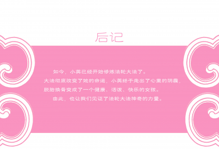Hiện giờ, Tiểu Anh đã bước vào tu luyện Pháp Luân Đại Pháp.